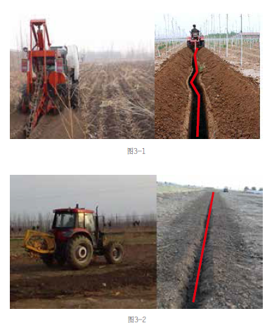 图3-1和图3-2分别是普通农机车和装置了司南AG300自动导航系统农机车在江苏大丰农场的测试现场对比图,可以看出安装了GNSS导航的农机车耕地非常直。