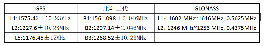 通过天线接收所有可见BDS/GPS/GLONASS卫星的信号,经前置滤波器和前置放大器的滤波放大后,再与本机振荡器产生的正弦波本真信号进行混频而下变频成中频信号,最后通过模数(A/D)转换器将中频信号转变成的数字中频信号;各卫星系统使用频率范围如下: