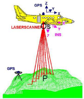 3) 姿态测量装置(IMU),用于测量扫描装置主光轴的空间姿态参数,由装置将接收到的GNSS数据,经过处理,求得飞行运动的轨迹, 根据轨迹的几何关系及变量参数,推算出未来的空中位置,从而测算出该测量系统的实时和将来的空间向量。由于在飞行过程中,飞机会受到一些外界因素的影响,此时,实际轨迹由惯导装置测定,通过动力装置调整,使飞行精确按原轨迹运动,所以该系统也称作为惯导系统。