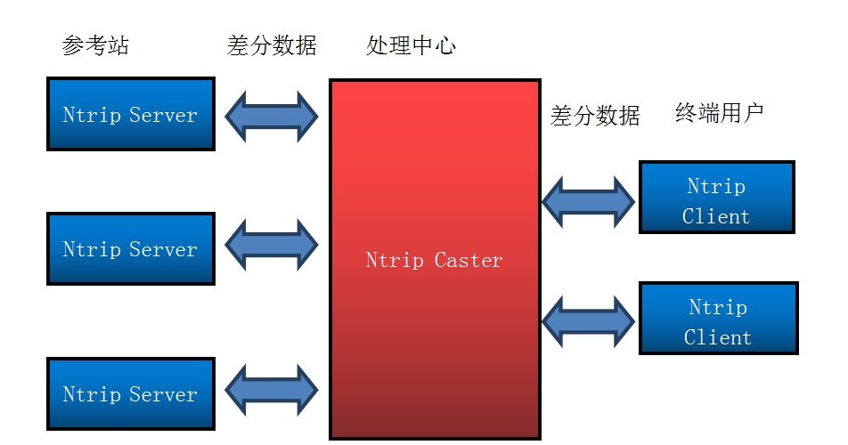 Ntrip协议是为在网络中传输导航数据设计的传输协议,该协议的构成部分如图2.6所示。Ntrip协议涉及三个部分Ntrip Server负责提供数据源,Ntrip Caster负责数据的多路分发,Ntrip Client获取NtripCaster分发的数据。