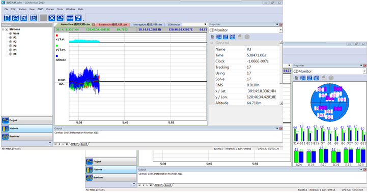 实时显示基线的变化情况、点位坐标变化情况等,软件包括如下视图:实时数据视图、实时网图、趋势图、卫星视图、三维视图、数据管理。